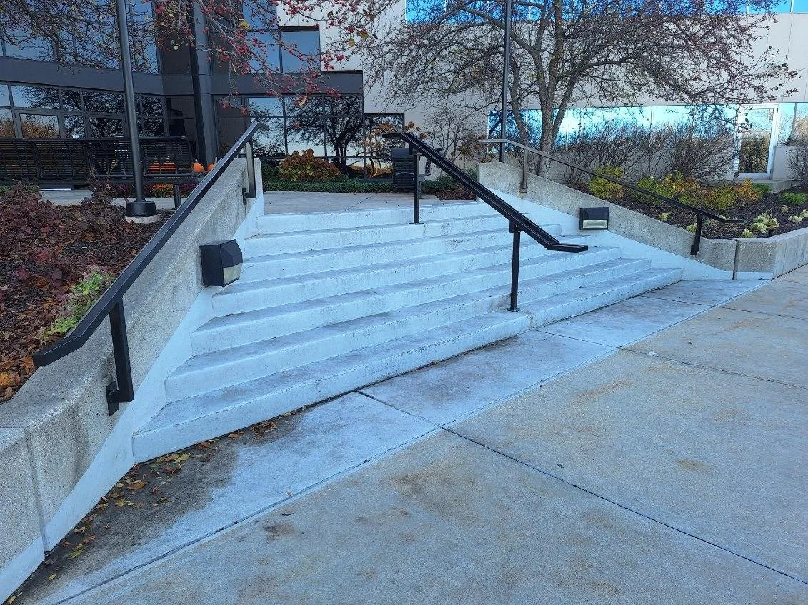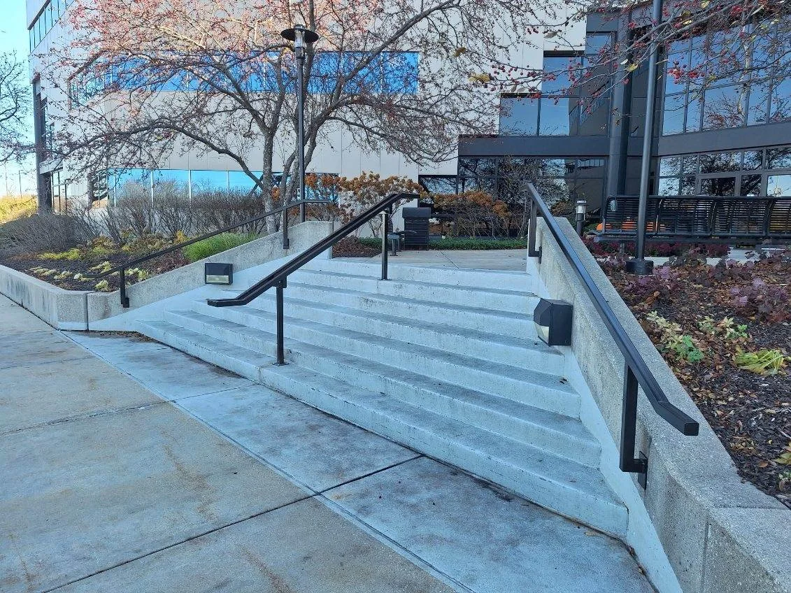 The fresh, shiny handrails below are part of a collaboration with Wangard Partners to update a commercial property in the Milwaukee area. This project encompassed significant planning. Two different handrail designs were required: one tying into the concrete bordering the steps, and another freestanding in the middle.